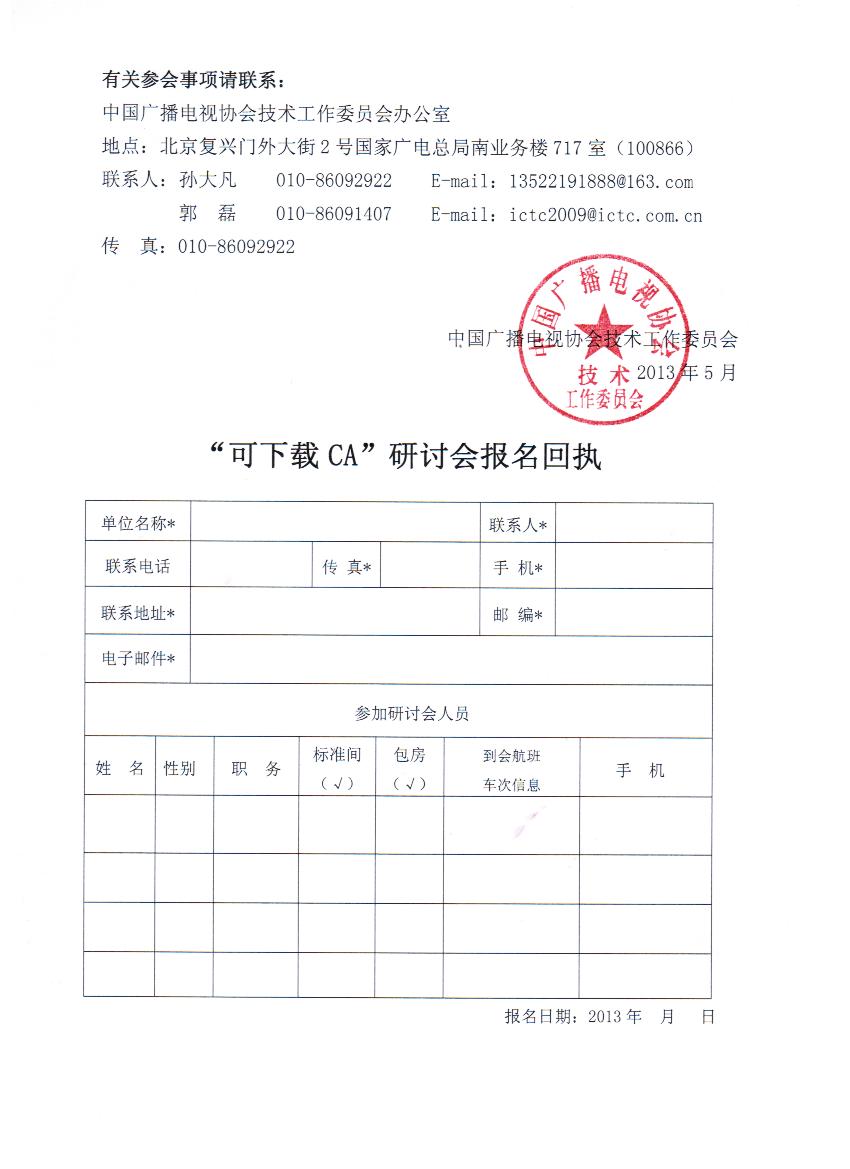 為了進一步推廣落實下載CA,2013年6月5日-6日,在總局科技司支持下,中國廣播電視技術協會技術工作委員會將在濟南召開“可下載CA研討會”,在本次會議上,將重點就DCAS技術體系、產品設備研發情況、DCAS部署應用模式、DCAS向多終端的新的應用形態等組織專題報告,并以推進DCAS產業鏈建設和應用為主題組織互動討論,敬請關注。