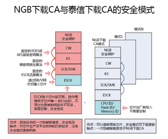 泰信開(kāi)發(fā)的下載CA技術(shù)架構(gòu)與總局頒布的NGB下載CA總體技術(shù)架構(gòu)一致,二者的比較框圖如下: