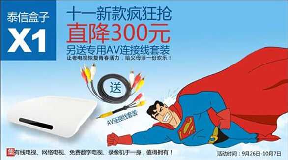 淘寶促銷篇:泰信盒子X1于9月20日在淘寶官方店全球震撼首發。此次國慶前夕,繼續加大促銷力度,在優惠直降300元的基礎上還送AV線套裝。詳情:http://shop112060586.taobao.com/