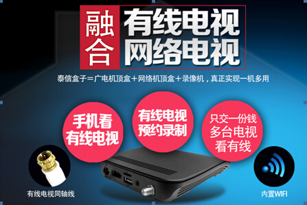 融合型智能高清有線電視機頂盒——泰信盒子,搭載泰信自主研發的直播電視操作系統DTVOS,融合廣電有線電視、網絡電視、錄像機等功能,實現全國性跨區域市場化銷售,讓廣大用戶購買有線電視機頂盒不必通過廣電,可以自由選擇,而且兼容了網絡電視的功能,讓您省掉一臺網絡機頂盒的費用。泰信電子這種歷史性的創新為廣電終端智能化和市場化發展鋪平道路,進而推動三網融合的落地和信息消費,讓老百姓看電視更方便。