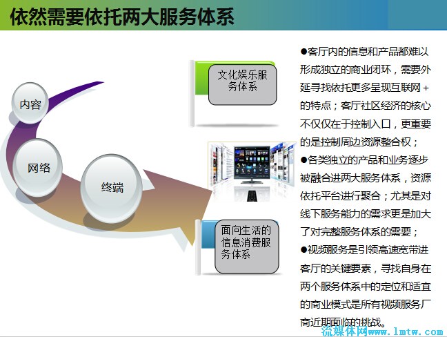 這里面電信運營商、廣電運營商也展開了一些嘗試,包括提供了探索和后向付費的市場,比如說廣告。包括給增值服務公司做流量包,做收入分成。其實這些東西都值得探討,后向付費我建議大家可以多嘗試,但是不要把它作為主業。如果說你們指著我做平臺,支撐所有增值服務商,你們那一招不行,為什么?你把它附加進去,最后人家反過來會把你覆蓋,作為一個業務從業者那不是一個合理的方式。我現在認可的是圈子里的觀點,那個觀點還不是主流,我相信未來會有越來越多頻道,無論是電信運營商還是廣電運營商,其實是同命相連的,走管道化之路都是沒有任何出路的,曾經電信行業里有過這句話:我要到管道運營商,但是現在走這條路是死路一條,如果不能找到一個1個億以上的用戶來維護管道,這個管道很快會被第三方分崩離析給吞噬,這句話無論是對電信還是廣電都同樣適用,至少要有一個1個億以上的用戶主打,才能保得住。