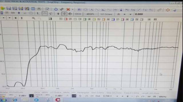 泰信把音箱的響應做到較寬適應范圍,實現HiFi級的高保真,就可以通過DSP進行音效調整,模擬各種品牌的音色。以下是泰信智慧家庭影院標準模式下實測頻響曲線,低音從30Hz開始有效,高音相應超過了20KHz。