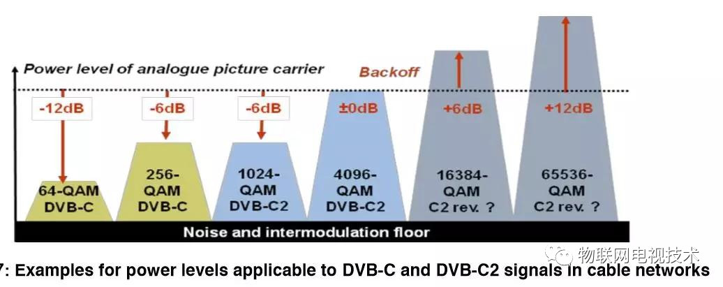 從該圖可以看出,現(xiàn)在普遍使用的DVB C 64QAM僅僅處于起始階段,結合香農第二定律比較容易理解該圖的意義:通過提高信號功率,采用更高階的QAM調制,有線電視仍大有潛力可挖。