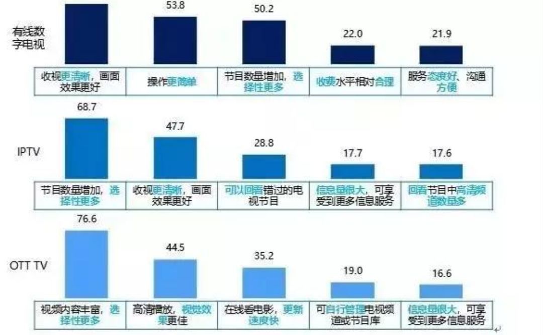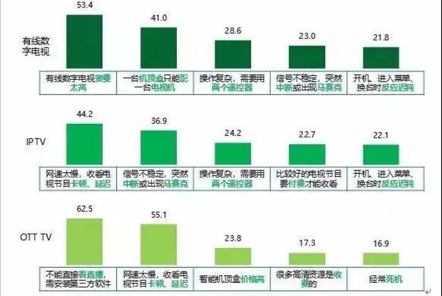從用戶的不滿意程度上看到,網絡電視速度慢卡頓排在第一位。這也間接印證了有線電視網絡的優勢。(以上調查來自美蘭德)