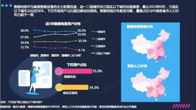 說出來你可能不信,幾乎人手一部的手機居然在下沉市場的“廝殺”中,輸給了智能電視。根據《報告》數據顯示,智能電視下沉用戶占比已達到55.9%,超出移動互聯網1.6個百分點。其實,智能電視作為家庭智能設備的主力,同時也是客廳經濟的核心,始終是一個家庭不能或缺的存在。80年代,因經濟條件限制,昂貴的“冰箱、電視、洗衣機”成為結婚必須的“三大件”,此時電視尚未大規模走入千家萬戶。但伴隨社會環境的變化以及科技的發展,電視的科技成分日漸高漲同時價格也日益低廉,這使得下沉市場智能電視用戶占比較2015年高出7.4個百分點,增速明顯。