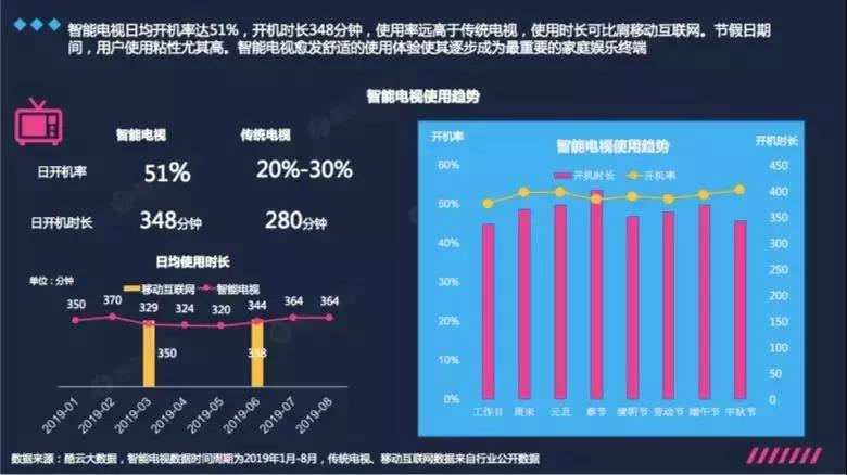 近年來,關于電視的唱衰之聲不絕于耳,論調集中在電視開機率低,買來只做客廳裝飾品上。但事實可能讓這些“唱衰者”失望了。目前,智能電視的日開機率達到51%,日開機時間達到348分鐘,使用時長遠高于傳統電視。同時,從日均使用時長上來看,智能電視在與手機的“比拼”中,也不落下風。在對智能電視使用趨勢的研究中,酷云互動還發現,每逢節假日,智能電視開機率及開機時長便雙雙增長,這也從側面反映了當前中國社會普遍出現的“宅經濟”、“懶經濟”現象,經過繁忙的工作后,更多用戶選擇呆在家中看電視、享受生活。