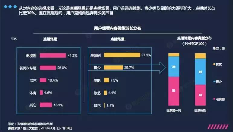 還記得每逢9月1日家里電視就被《開學第一課》支配的恐懼嗎?根據酷云EYE Grow數據顯示,2019年的《開學第一課》直播關注度達到了11.0389%,與2018年相比直播關注度增長了2.2080%。如此高關注度背后映射出的是,青少類節目已成為影視綜之外,最具增長實力的節目類型。《報告》顯示,目前在點播場景下青少節目排名僅次連續劇,占比近30%,且假期期間用戶更傾向選擇青少類節目。究其原因,酷云互動認為,非假日期間家長為安撫年幼的孩童,更樂于點播青少類節目,以此使孩子安靜下來,降低其在家中的“破壞性”。假期期間,父母會將電視選擇權交給孩子,讓他們點播自己喜愛的青少類節目。因此,青少類節目正成為繼影視綜外,觀眾觀看需求增長迅速的節目類型。