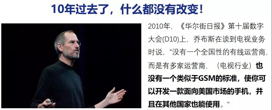 2010年,在《華爾街日報》第十屆數字大會(D10)上,喬布斯在談到電視業務時說,沒有一個全國性的有線電視運營商,而是多家運營商,(有線電視行業)也沒有一個類似于GSM的標準,使你可以開發一款面向美國市場的手機,并且在其它國家也能使用。所以,蘋果一直沒有進入電視市場參與創新。