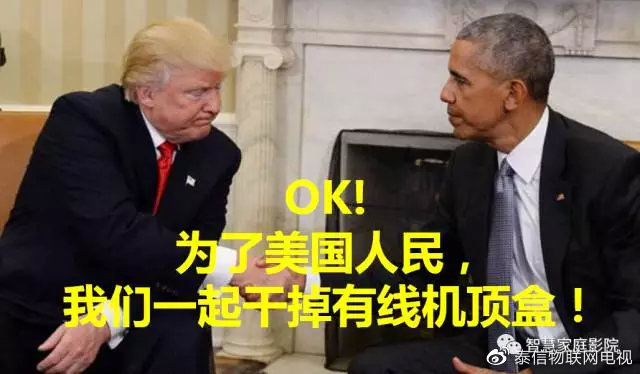 2016年特朗普一上臺,就推翻了上屆政府的很多政策,但對奧巴馬政府沒有完成的“機頂盒開放提案”卻高度支持。在美國看有線電視是個高消費,每月支出至少100美元,特朗普要為低收入家庭說話。在他上任前,還同奧巴馬商量,如何干掉機頂盒。